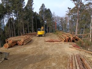 昨年末より、架線集材の皆伐現場で架設作業を行っています。